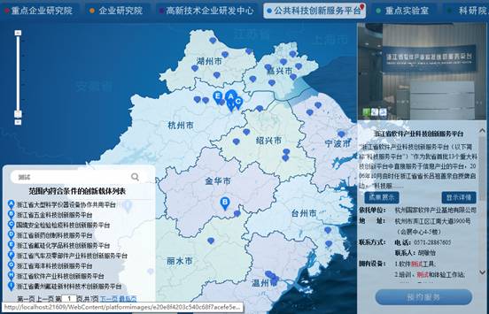 1. 企業(yè)或創(chuàng)業(yè)者從科技云平臺首頁www.zjsti.gov.cn登錄系統(tǒng)后點擊"預約服務(wù)"按鈕進入創(chuàng)新地圖(或直接從科技云平臺首頁點擊"創(chuàng)新地圖"圖標進入)。在左側(cè)搜索框內(nèi)輸入所需要的設(shè)備或服務(wù)的關(guān)鍵字(如:測試),點擊搜索按鈕即可查找到符合條件的載體及服務(wù)信息。